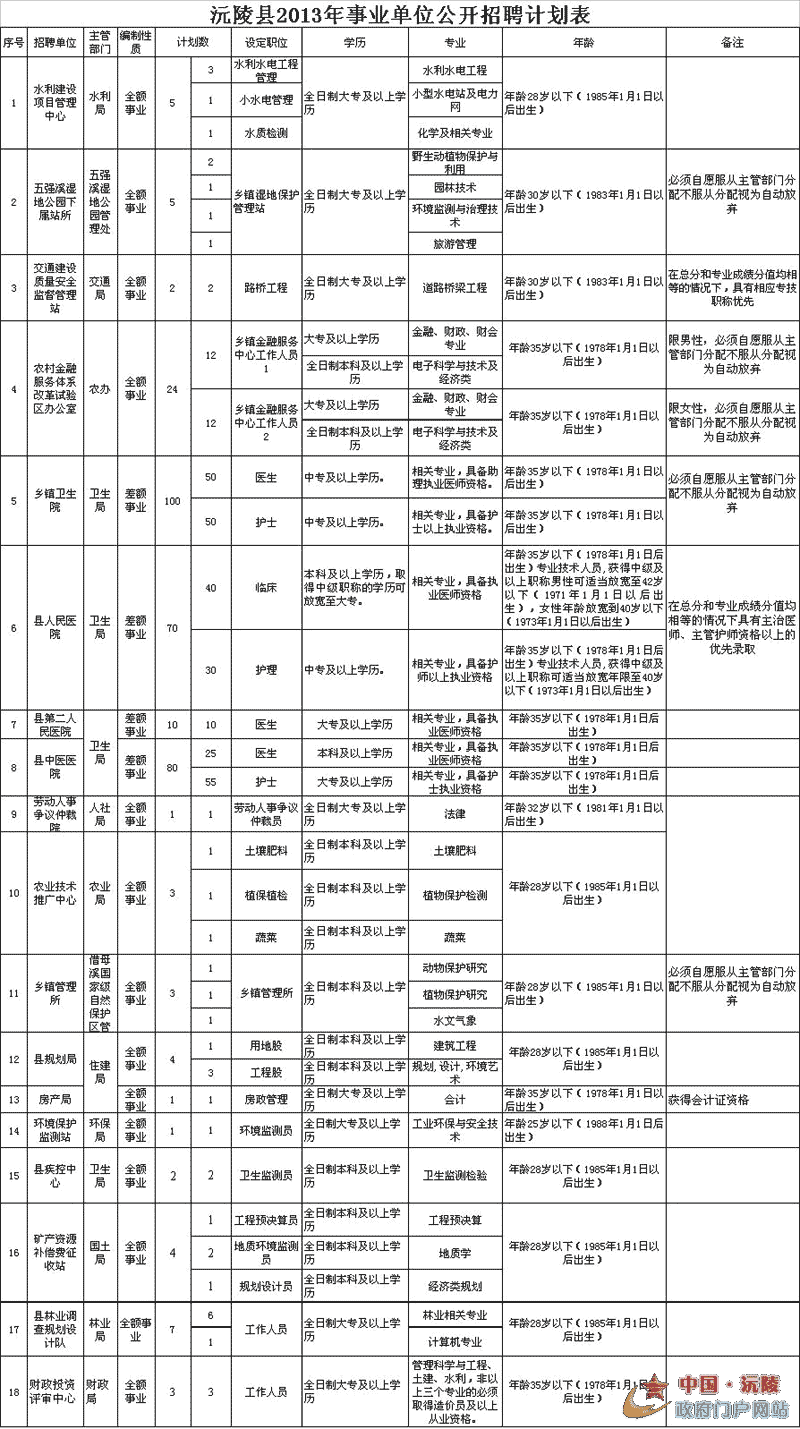 本次面向社会公开招聘工作人员的事业单位18个,计划招聘325人。各单位招聘职位、人数和相关要求见《沅陵县2013年事业单位公开招聘计划表》。